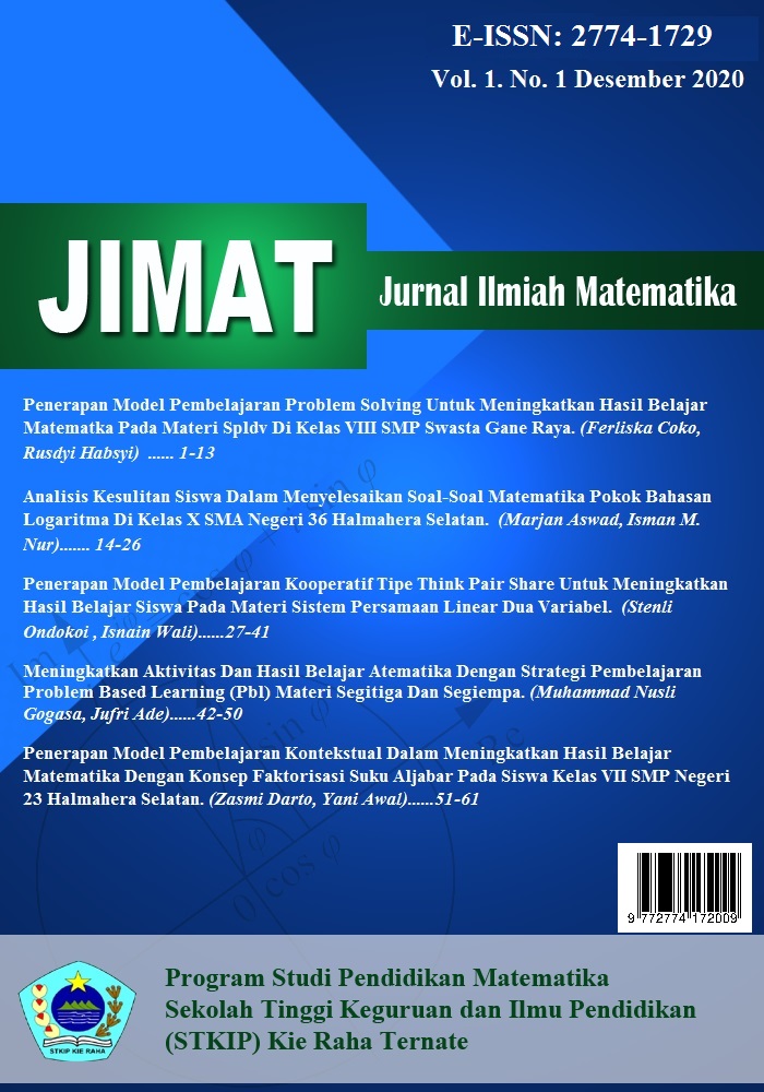 Vol 1 No 1 (2020)Terbitan kali ini pada Jurnal Ilmiah Matematika memuat lima artikel yang masing-masing membahas tentang, penerapan model pebelajaran baik model pembelajaran Problem Solving, Kooperatif Tipe Think Pair Share, Problem Based Learning (PBL), Pembelajaran Kontekstual, dari empat artikel ini memiliki tujuan penelitian yang sama yaitu meningkatkan hasil belajar siswa dengan menggunakan metode penelitian tindakan kelas, sedangkan satu artikel meneliti tentang analisis kesulitan siswa dalam menyelesaikan soal-soal logarita.