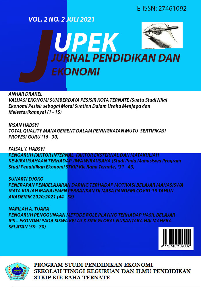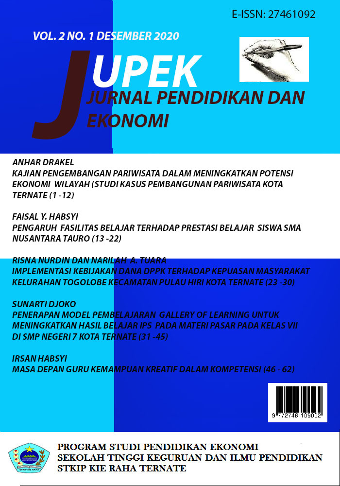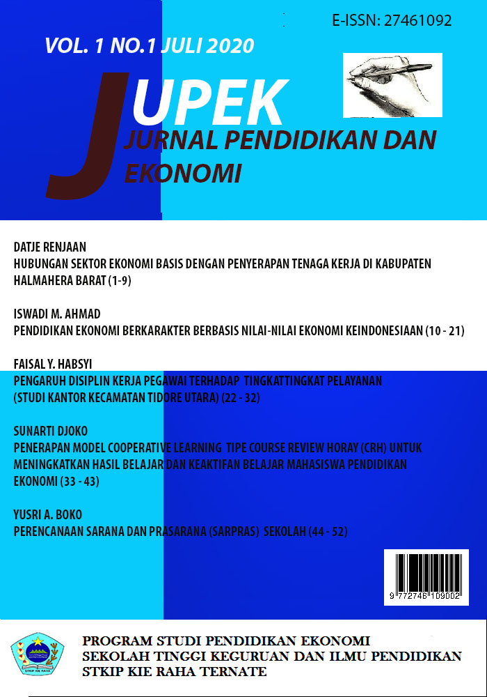 Vol 5 No 2 (2024)Jurnal Pendidikan Pendidikan dan EKonomi (JUPEK) merupakan jurnal terbitan berkala dengan nomor e-ISSN (onlie) 2746-1092. Jurnal Pendidikan dan Ekonomi (JUPEK) ditebitkan pertama kali pada tahun 2020 oleh Program Studi Pendidikan EKonomi STKIP Kie Raha Ternate. Pada bulan Juli 2023 terjadi perubahan perguruan tinggi dari STKIP Kie Raha Ternate menjadi Institut Sains dan Kependidikan (ISDIK) Kie Raha Maluku Utara. Volume 5 nomor 2 telah diterbitkan pada bulan juli 2024 pada website https://ejurnal.isdikkierahamalut.ac.id/index.php/jupek, namun website tersebut telah diretas, sehingga menyebabkan hilangnya data yang telah dipulikasi. Untuk itu kami mempublikasi kembali pada website ini. Kami mohon maaf atas ketidaknyamanan ini dan kami berharap jurnal ini dapat kembali melayani para peneliti dan praktisi dalam mempublikasi hasil-hasil penelitian yang berkaitan dengan pendidikan, pendidikan ekonomi, ilmu ekonomi dan kewirausahaan.