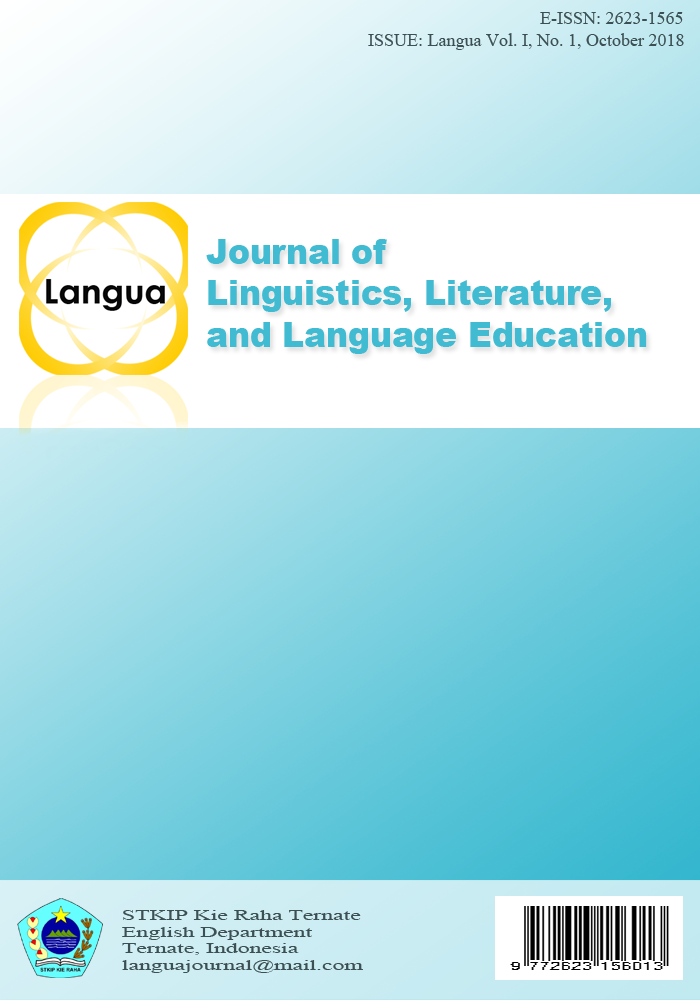 Vol 1 No 1 (2018)In this first issue of Langua: Journal of Linguistics, Literature, and Language Education, this journal publishes research reports accomplished by the students of English Department of STKIP Kie Raha Ternate except one article is written by two lecturers in the same department. The articles in this issue are concerning the theory and practices of English Language Teaching in Ternate (North Maluku, Indonesia) and around. Some learning models effectiveness are reviewed here including Problem-Based Learning, Directed Reading and Thinking Activity, and Talking Stick. Translation errors made by the students in translating presidential speech are also investigated. There is also an article investigated the correlation between grammar knowledge and logic. In the English Education field, the implementation of Curriculum 2013 is also reviewed. And the last one is the comparative study on the impact of English Teacher Certification towards students' grammar understanding. This issue is published with expectation that the articles contribute useful information regarding the theory and practices of English Language Teaching and English Education.